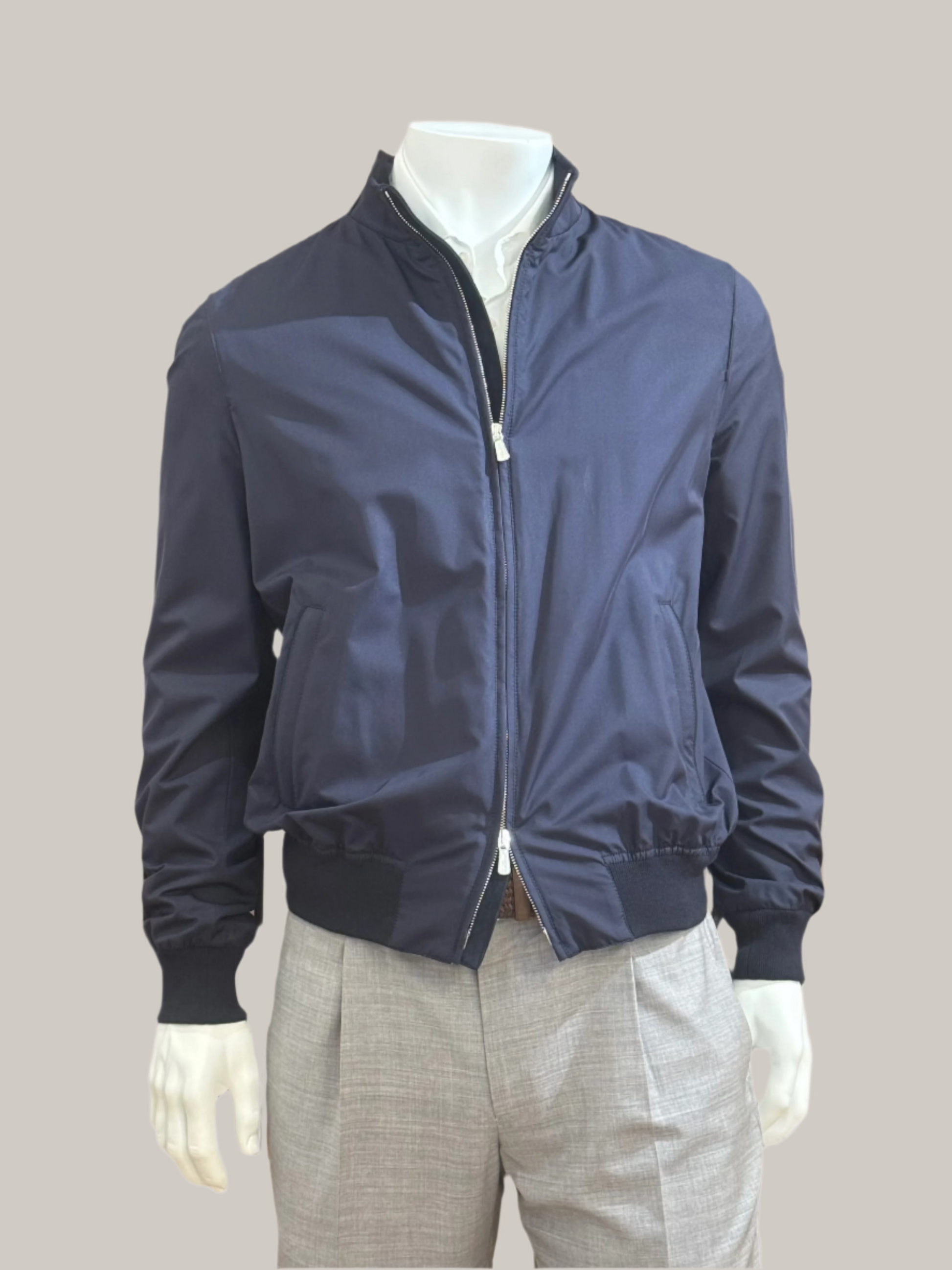 Navy Blue Technical Silk Bomber with elastic cuff and bottom